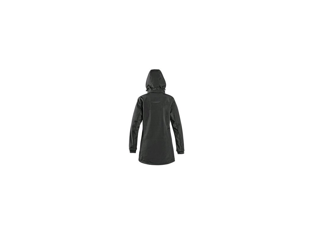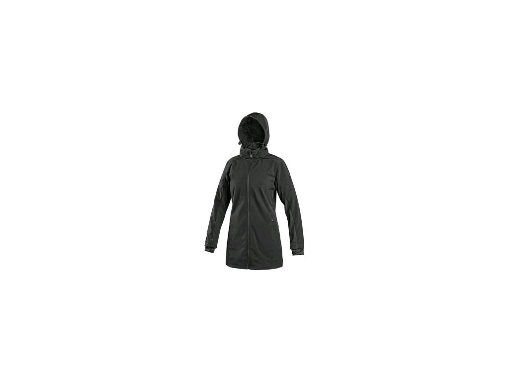 Dámsky softshellový kabát s odopínacou kapucňou, odolný proti vode a vetru, zapínanie na zips, rukávy s vnútornými manžetami, sťahovanie v dolnom okraji, spodné vrecká na zips, relfexné doplnky, TPU membrána, odolnosť materiálu proti prieniku vody 10 000 mm mimo oblasť švov g/m2/24h.