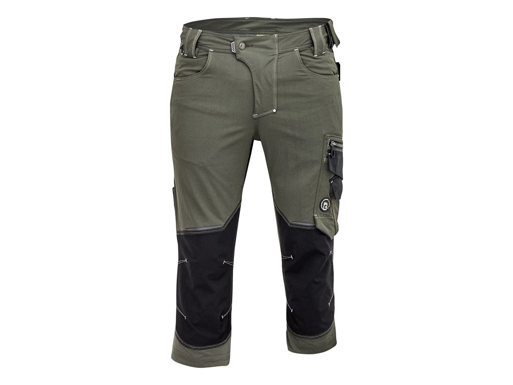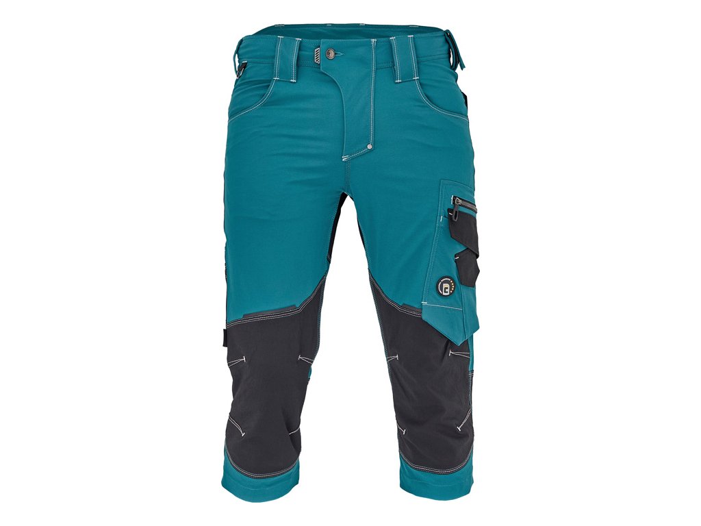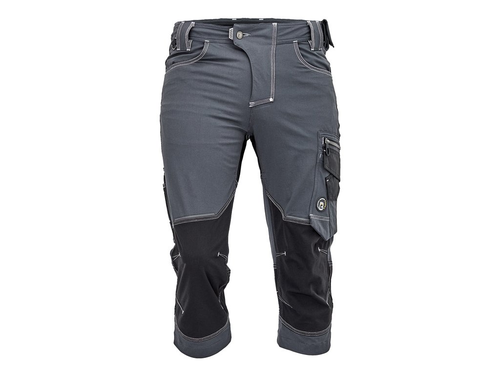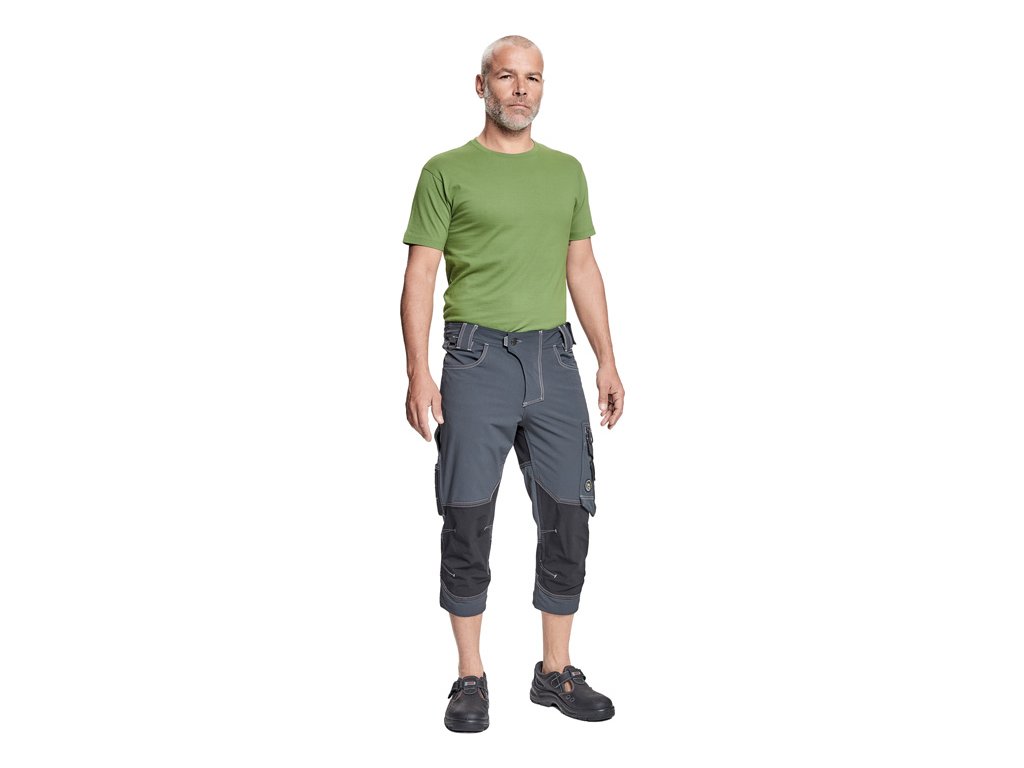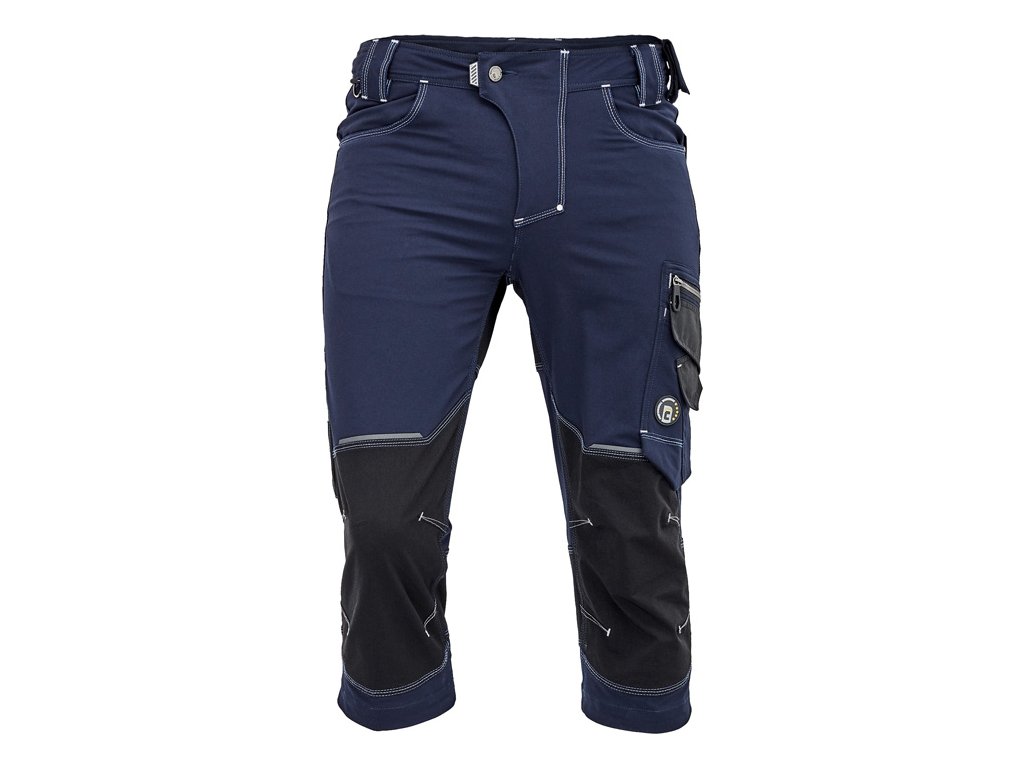 pracovné 3/4 nohavice, elastický inovatívny materiál TRIFIBETEX PRO, slim strih, znížený pružný pás, odolné trojité prešitie nohavic a sedu, 2 predné klinové vrecká, 2 zadné vrecká na suchý zips, ľavé stehenné multifunkčné vrecko, pravé stehenné vrecko na meter a nôž, "D" krúžok, pútko na náradie v páse, CORDURA zosilnenie v oblasti kolien, originálne spracovanie zapínania nohavíc, reflexné prvky vo farebnom odtieni. Materiál: 90% nylon, 10% Spandex®, 240 g/m2.