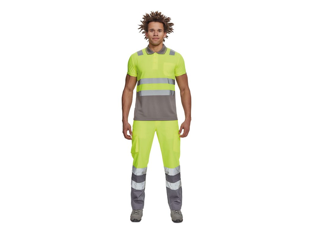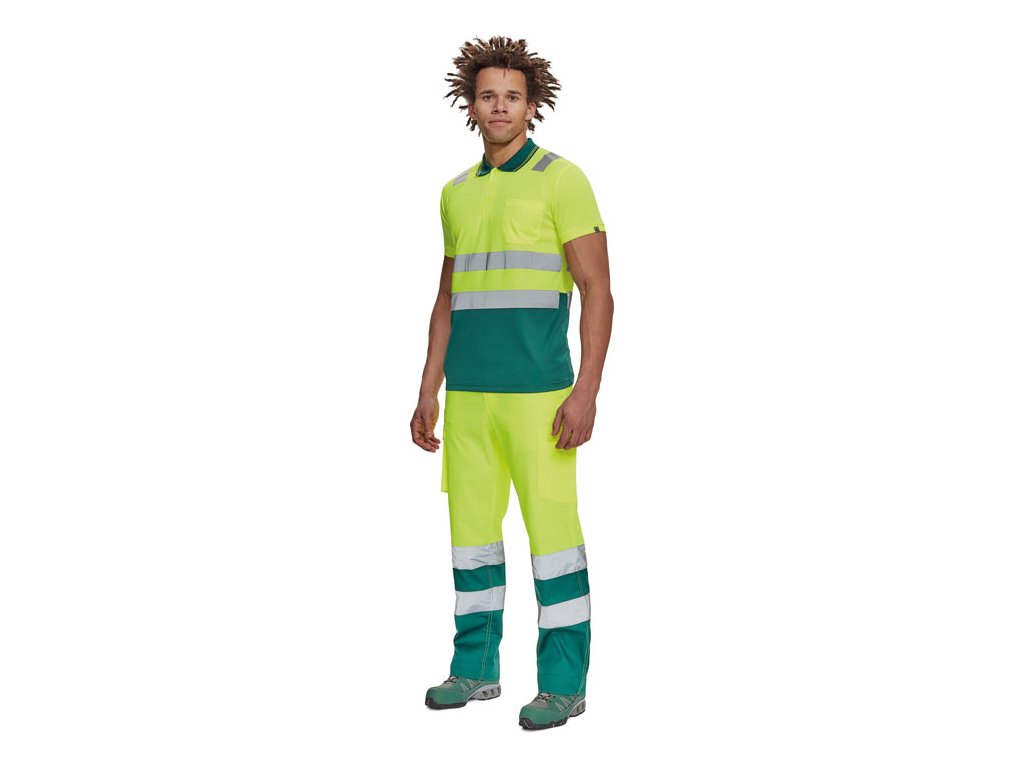 Pánska Hi-Vis polokošeľa s reflexnými doplnkami cez ramená a v bokoch o veľkosti 5 cm, zapínanie na 3 gombíky, 1 náprsné vrecko, rebrovaný golier a lemy rukávov.