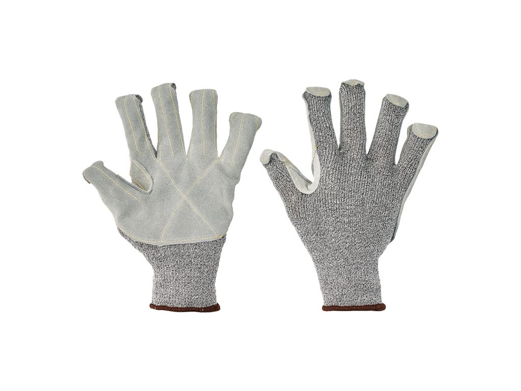Pletené, bezšvové rukavice z modifikovaného skleneného vlákna, Spandexu a nylonu, so zosilnením z hovädzej štiepenky v dlani a na prstoch, zdvojenou vrstvou medzi palcom a ukazovákom, prekrytými špičkami prstov a odolnosťou proti prerezu tr. E.
