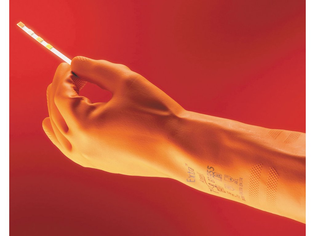 Chlórované rukavice zo 100 % prírodného 0,75 mm silného latexu bez plnidiel, s velúrovou úpravou vo vnútri, reliéfnym povrchom v dlani a na prstoch, v celkovej dĺžke 32 cm.