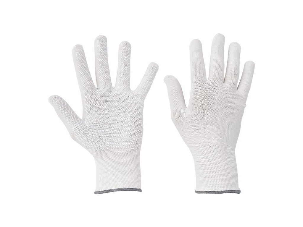 Bezšvové rukavice z polyesteru s PVC terčíkmi v dlani. Pružná manžeta.